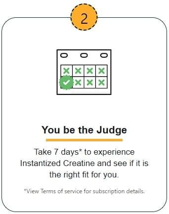 It's simple! We send you a 7 serving (7 day supply) bag of Instantized Creatine and give you 15 days to see if the product works for you. After 15 days, we'll make your life easier and send you a monthly supply. If you don't like it, you can cancel anytime.